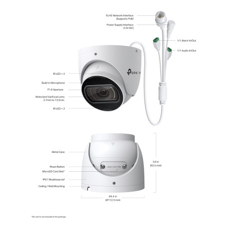 Caméra turret IP TP-LINK InSight S445ZI 4MP avec objectif varifocal motorisé 2.7-13.5 mm, IR 60m, IP67, IK10, classification humain/véhicule et PoE 802.3af/at.