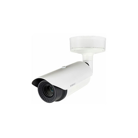Caméra thermique VGA Hanwha TNO-L4050T avec résolution 640x480, détection avancée, stockage micro SD 256GB, boîtier IP66 IK10 pour usage extérieur sécurisé.