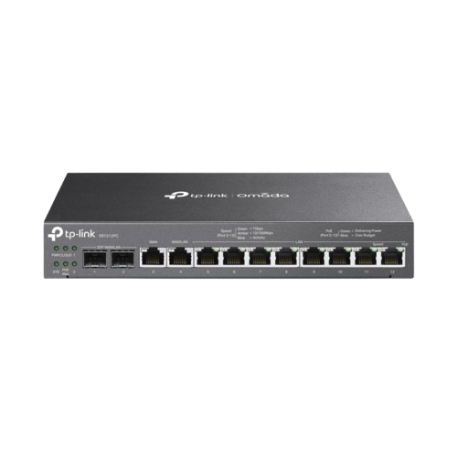 Routeur VPN Omada ER7212PC 3-en-1 avec 8 ports PoE+, gestion cloud centralisée, protection contre surtensions 4 kV, montage bureau ou mural, idéal pour réseaux professionnels.